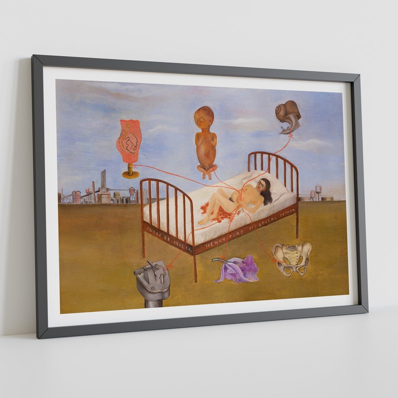 The central figure of Kahlo herself is depicted with tears. Henry Ford Hospital by Frida Kahlo is a powerful and emotionally charged painting that captures the artist's physical and emotional pain following a miscarriage
